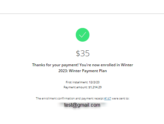 - Give it a few seconds for payment to process. A confirmation receipt will appear showing you have successfully enrolled into a payment plan & paid the enrollment fee.